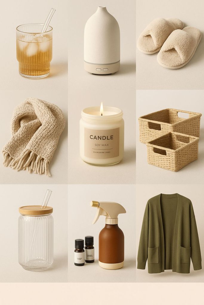 Optional Amazon items: a cute glass cup for morning water, a comforting oil diffuser, soft slippers.